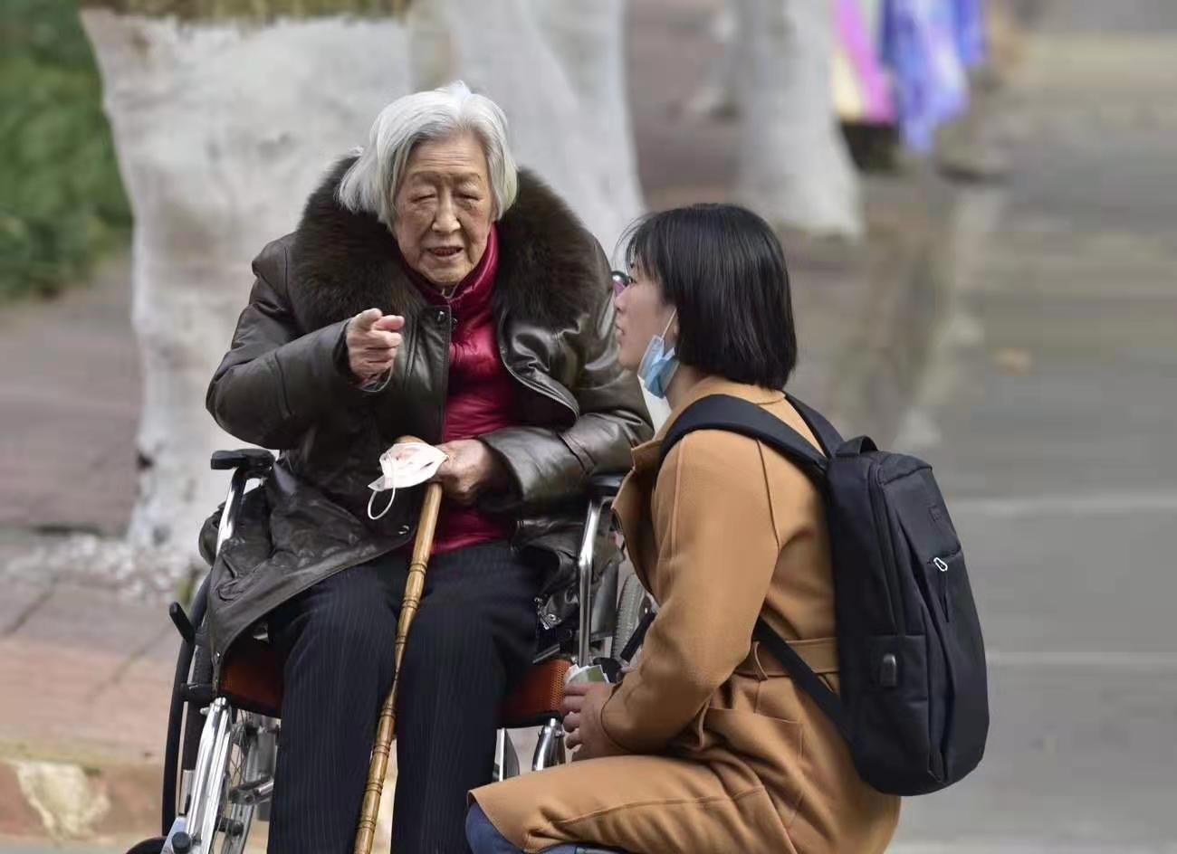 3月5日上午,天空露出笑脸,校园春光明媚。我在这张照片的不远处照玉兰花。我听到这位婆婆对身旁的女生说:“你要努力学习,争取考研、考博。”女生则礼貌地弓身下蹲,不断应声。于是赶紧按下快门。经打听,得知这位老人是beat365官网离休干部贺新民的爱人,也是在蓉高校的退休教师,今年已经九十有余,而老人与学生之间并没有任何亲属关系。我时常走在师大校园里,常常能见到这种和谐动人的场景。传道授业,润物无声,就是在这样日常的交流之中,文化之脉得以传承。